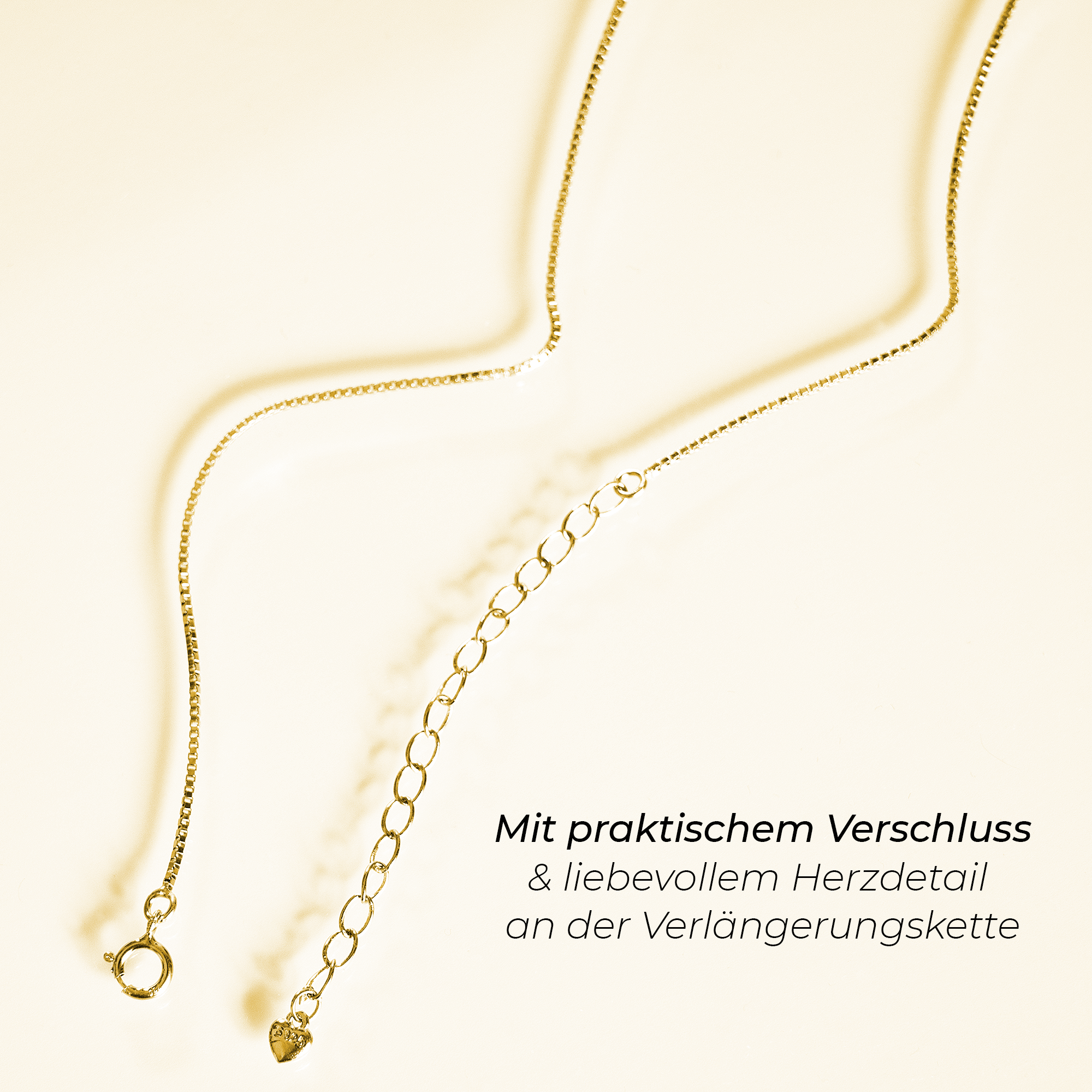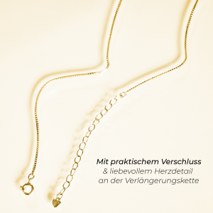 Damit du jahrelang Freude an deinem Herzstück hast: Trage es nicht beim Duschen, Schwimmen oder Schlafen. Ein gelegentliches sanftes Reinigen mit einem weichen Tuch genügt vollkommen. Bewahre dein Schmuckstück in der hochwertigen Geschenkbox auf, wenn du es nicht trägst. Vermeide den Kontakt mit Parfüm, Haarspray und anderen Chemikalien – so bleibt der Glanz erhalten.